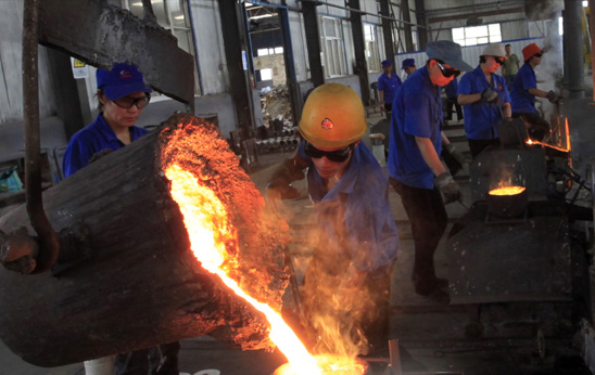 8月9日,當(dāng)天的最高氣溫34度。澤州縣巴公裝備制造工業(yè)園里,鑄造車間的工人們頂著近40度的高溫在認(rèn)真工作。 立足產(chǎn)業(yè)基礎(chǔ)和區(qū)位條件,主攻資源深加工轉(zhuǎn)化,狠抓冶鑄及裝備制造、現(xiàn)代煤化工等產(chǎn)業(yè)鏈條的培育,使?jié)芍菘h成為全市有煤縣中非煤產(chǎn)業(yè)比重最高的縣,非煤產(chǎn)業(yè)高達(dá)60%。但今年以來,由于受國內(nèi)外經(jīng)濟(jì)形勢的影響,特別是受煤炭、鋼鐵、鑄造等產(chǎn)業(yè)市場需求不旺,價格下滑的影響,澤州縣主要產(chǎn)品總體上處于“雙降”趨勢,即產(chǎn)量價格雙下降。上半年,全縣工業(yè)增加值增長6.2%,排名全市倒數(shù)第二。影響因素有四個方面:一是煤礦生產(chǎn)不正常,目前僅有天戶煤業(yè)、西成莊煤業(yè)等2家煤礦生產(chǎn),其他或處于停產(chǎn)狀態(tài),或轉(zhuǎn)入基建礦井,1-6月份影響原煤產(chǎn)量200萬噸,影響工業(yè)增加值8億元;二是晉鋼集團(tuán)由于環(huán)境趨緊硬約束停產(chǎn),6月下旬組織恢復(fù)生產(chǎn),5、6月份影響鋼鐵產(chǎn)量40萬噸,影響工業(yè)增加值3億元;三是化肥市場4月份以來持續(xù)下滑,價格下降(1700元/噸,同比下降500元/噸左右,且銷售不暢),需求萎縮,1—6月份產(chǎn)量同比有所下降;四是鑄管件市場今年以來持續(xù)需求不振,同時價格下降,產(chǎn)量下滑。